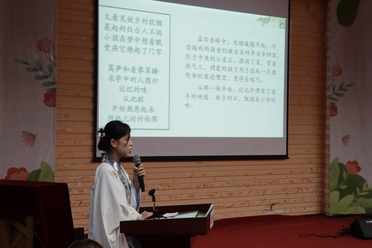 主持人首先向大家介绍了比赛规则与评分细则。要求各队呈现一支改编好并演唱出来的歌曲;化用至少4句古诗词进入歌词;分享自己的创作故事。评委分为6个方面对作品进行评分。接下来,李明教授致开场辞。他表示,此次比赛是同学们对专业知识、技能的学以致用,是中文专业技能的实践应用,同学们根据个人的理解将众多因素融合在一起,用作品讲好自己的“人生故事”,用作品传递自己对人生的理解,这将成为同学们不可磨灭的青春记忆,给同学们以文学的启迪。更激励同学们今后要像屈原、杜甫、苏轼等具有高尚情怀的文学家一样用自己创作的作品讲好人生的每一个故事。