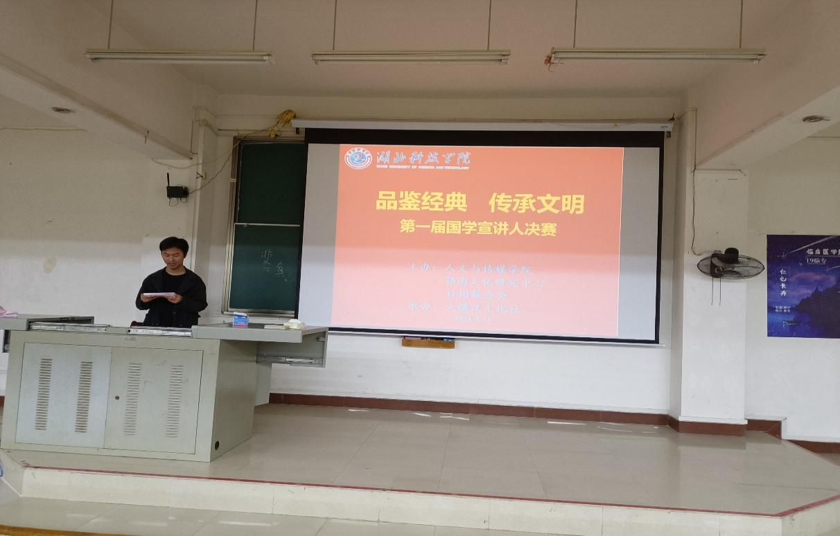 2023年4月11晚,为了弘扬中华优秀传统文化,传承与传播国学经典,提升大学生的人文素养,厚积校园文化底蕴,由tyc7111cc太阳成集团、鄂南文化研究中心、学校社联主办、“式微汉文化社”承办的第一届国学宣讲人活动在教三302教室圆满落幕。