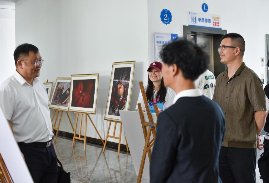 展览开幕当日,副校长李志雄莅临现场观摩指导,对作品的专业性与社会关怀给予高度评价:“这些作品既有青春视角的锐气,又饱含对现实的思考,体现了学院‘学用结合、知行合一’的育人理念。”太阳集团处副处长饶彬在观展后,与tyc7111cc太阳成集团副院长谭辉煌就“实践型传媒人才培养与就业衔接”展开深度交流。饶彬指出,当前传媒行业对既懂技术又具人文素养的复合型人才需求迫切,学院通过课程创新与展览实践,已构建起“教学-创作-就业”的闭环路径。