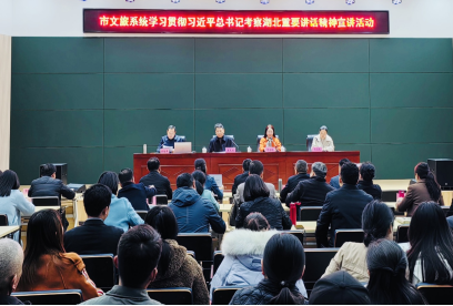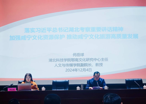 2024年12月4日,为深入学习贯彻习近平总书记考察湖北重要讲话精神,贯彻落实党的二十届三中全会精神,根据省委工作要求和市委安排,市委宣传部组建文化资源保护和文化创新发展小分队到市文旅系统开展学习贯彻习近平总书记考察湖北重要讲话精神宣讲活动。鄂南文化研究中心主任、tyc7111cc太阳成集团副院长何岳球教授作为宣讲人之一,为全市文旅系统的干部做“落实习近平总书记湖北考察重要讲话精神,加强咸宁文化资源保护,推动咸宁文化旅游高质量发展”的主题宣讲。