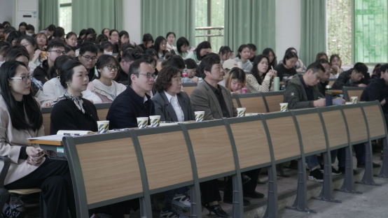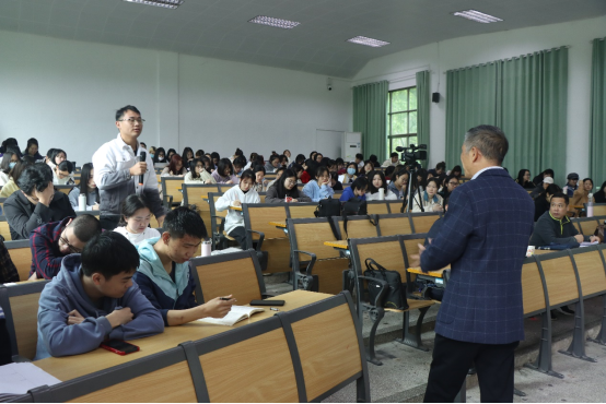 夏康全老师则以“了解课堂标准,提高课堂效率”为主题,以“中国学生发展的核心素养是什么呢?”为切入点,分别从“如何使用教材?”“如何开发/编写教材?”两方面为同学们介绍了新课标教学的变化,他呼吁同学们要以语文学科核心素养为考查目标,依据高中学生语文学业质量标准相应要求,通过阅读与鉴赏、表达与交流、梳理与探究等语文实践活动,呈现语文核心素养的发展过程。这两场报告让汉语言师生再一次感受到了语文名师的魅力和风范。